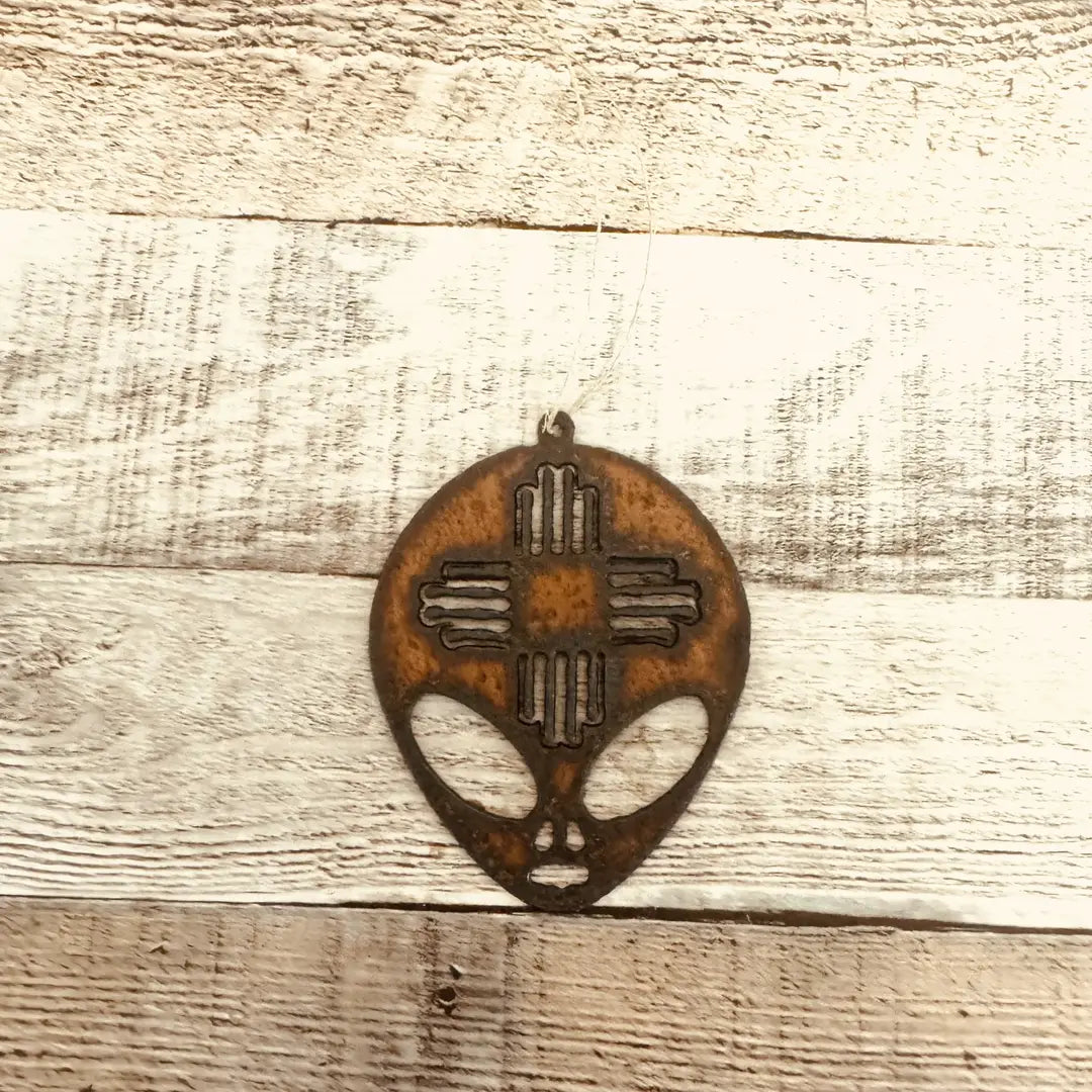 Alien Head with Zia New Mexico Rustic Ornament 4 x 3.25". Take a trip with the paranormal and the unexplained with this unique piece that also features symbolism from the Southwest.