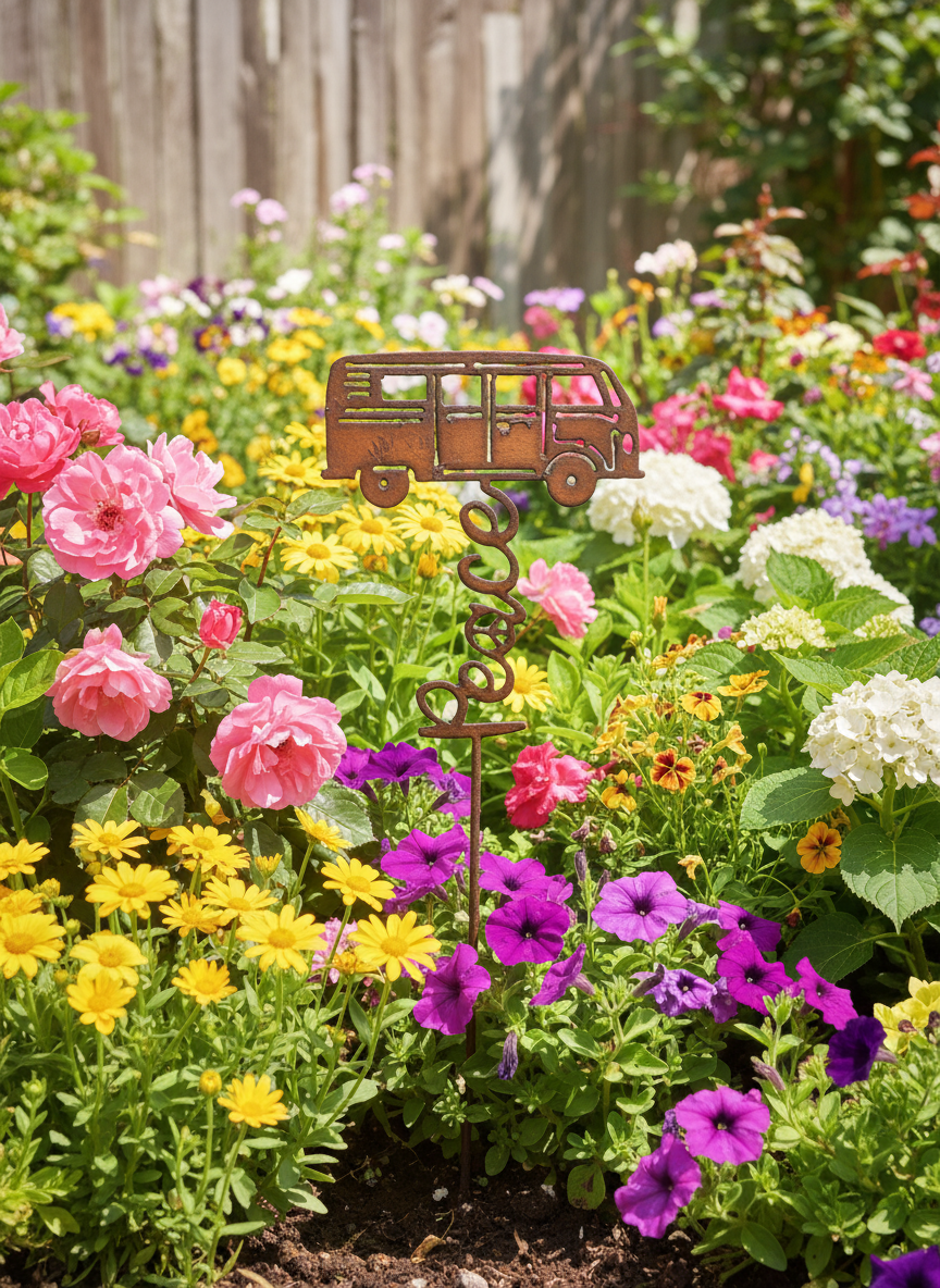 Introducing the Peace Slug Bus with Peace Hippie Garden Stake from Universal Ironworks Inc. This garden stake, showcasing a VW with Peace design, is not just a product but an art piece that brings a touch of rustic charm to your outdoor space. It's a perfect blend of functionality and style, made with American steel and individually rusted for that vintage appeal.