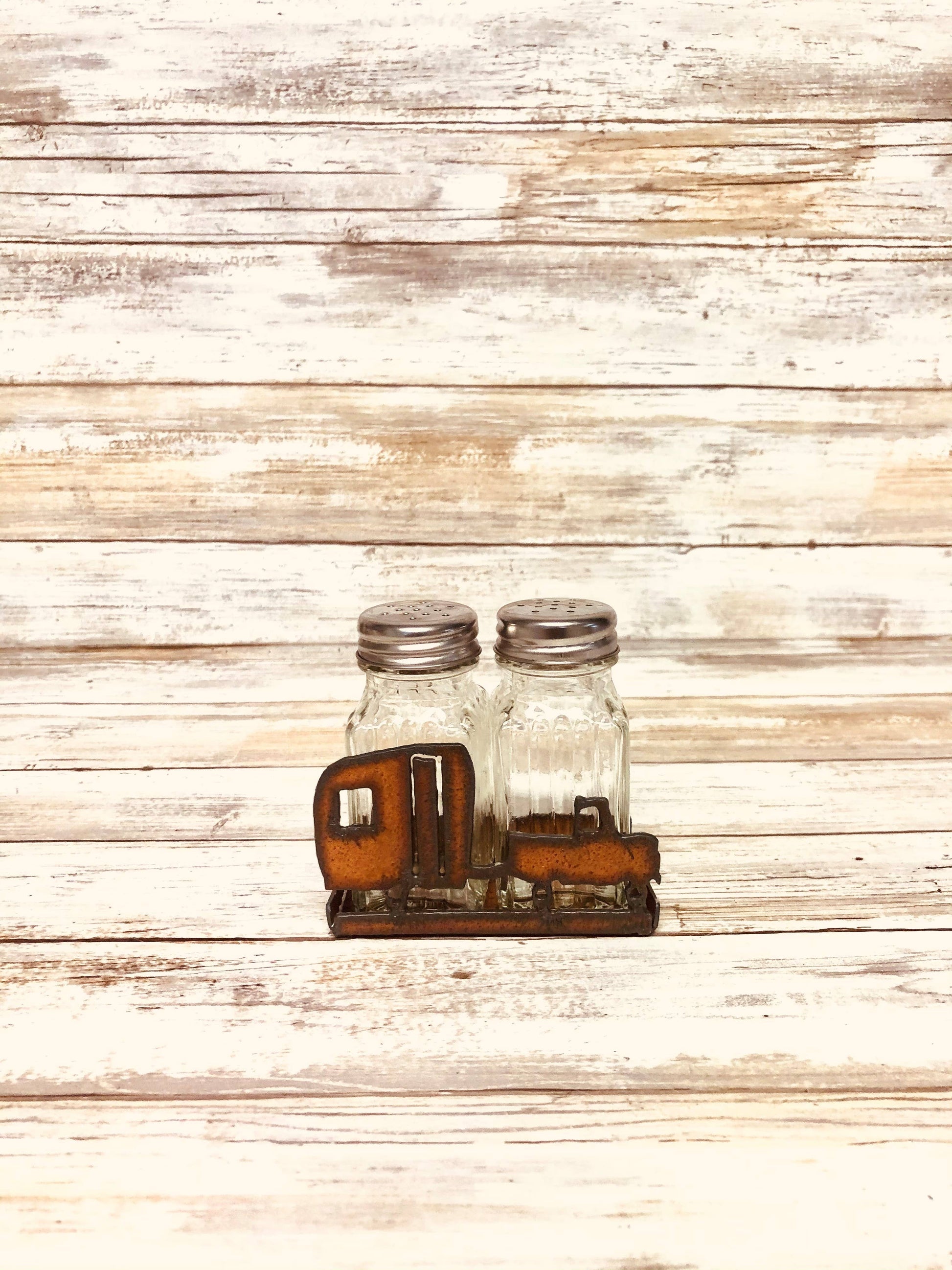 Experience the rustic charm with the Truck and Camper Trailer Salt n Pepper Holder by Universal Ironworks Inc. This unique piece brings a touch of the great outdoors to your kitchen. A perfect blend of functionality and artistry, it's more than just a kitchen tool, it's a piece of decor that reflects your love for adventure and the open road. Base Measures 4"x2" with the ornament measuring between 3.5-5H"